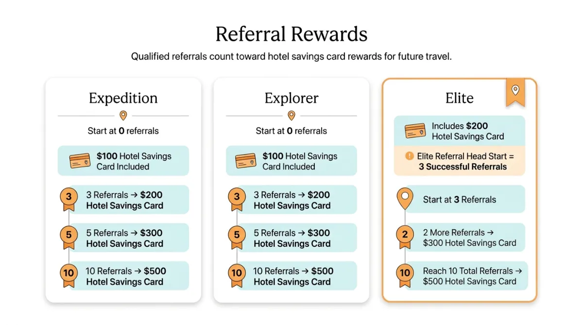 Expedition and Explorer each include a $100 hotel savings card. Elite includes a $200 hotel savings card as well as an Elite Referral Head Start equal to 3 successful referrals.