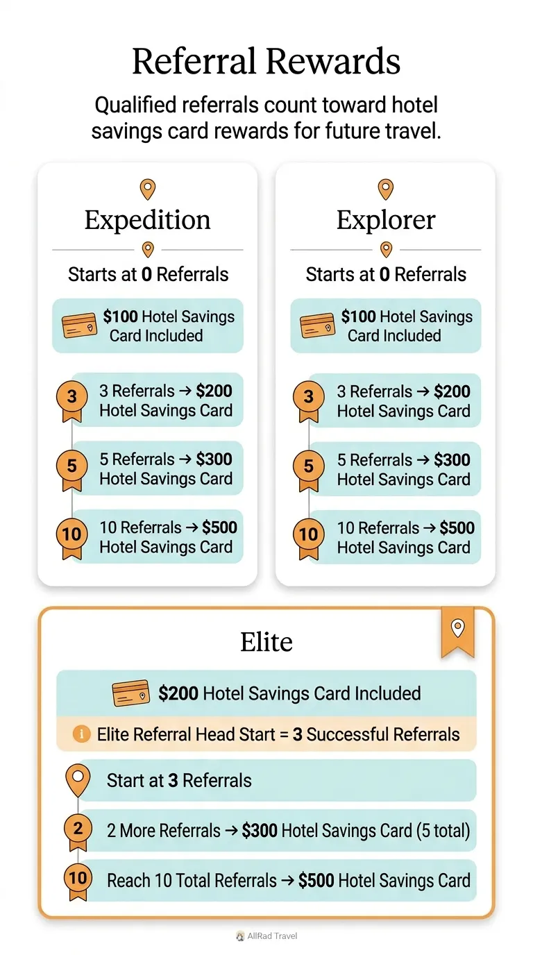 Referral rewards apply only to qualified and verified purchases.AllRad Travel reserves the right to review referral activity before issuing rewards. Duplicate, incomplete, canceled, refunded, or ineligible purchases do not count toward referral totals. Hotel savings card rewards are for future travel and are separate from the savings card included with your tier purchase. Referral reward timing may vary depending on purchase verification and processing.